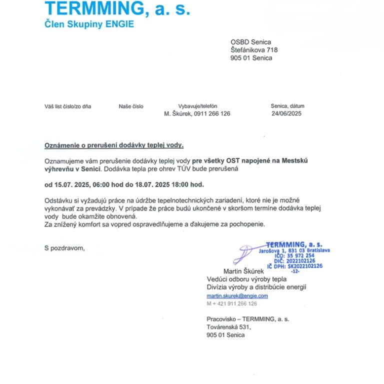 Oznámenie o prerušení dodávky teplej vody z Mestskej výhrevne Senica 1Stiahnuť